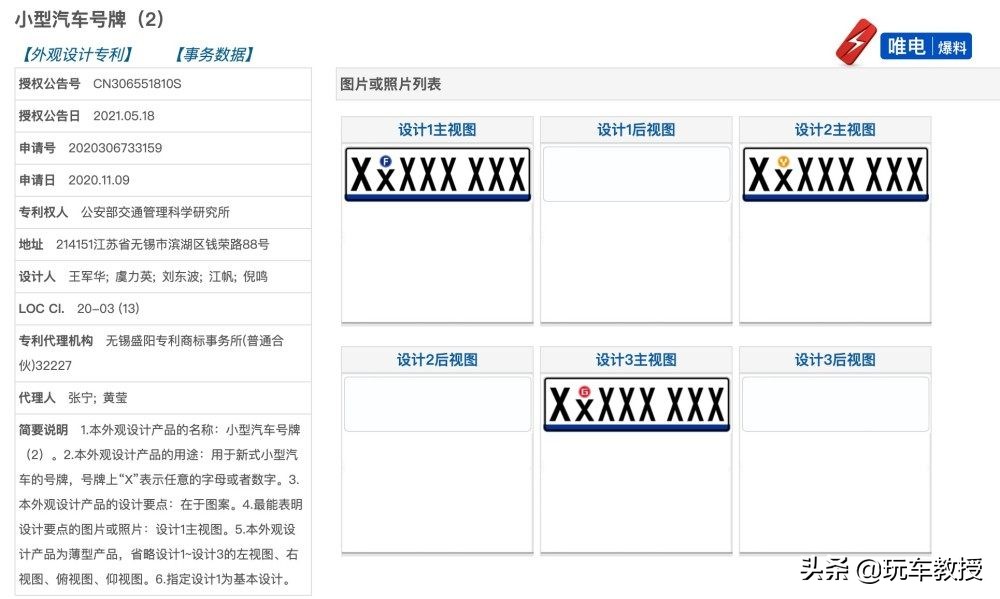 近日,教授从相关渠道获取了来自公安部交通管理科学研究所申报的全新车牌样式外观专利图,此次全新车牌包括了“小型汽车号牌”与“临时行驶车号牌”两种。从该专利图来看,全新车牌与现款车牌在设计样式上、字数等有很大的不同。